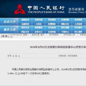 据中国人民银行网站消息,中国人民银行授权全国银行间同业拆借中心公布,2024年4月22日贷款市场报价利率(LPR)为:1年期LPR为...