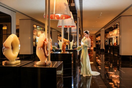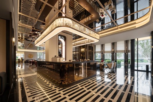 一棵由设计团队历经数月找寻的百年朴树,未来将移植至园区;臻选蓝翡翠奢石,雕琢生活美学馆细节之处,提前预演未来运用至园区时的高难度拼接工艺;将生活的腔调融进生活美学馆脉络中,以海派风格演绎凤栖和鸣的未来优雅日常......